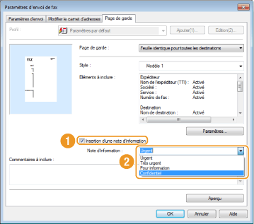 Les notes d'information telles que "Urgent" et "Confidentiel" sont disponibles. Vous êtes également libre de taper directement des caractères dans [Note d'information] au lieu de sélectionner une note dans la liste.