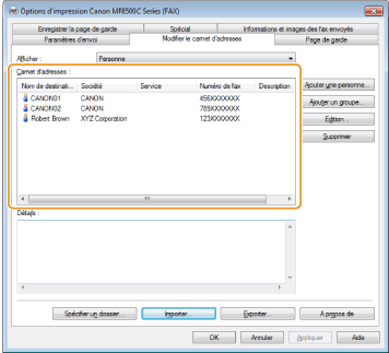 Les données du carnet d'adresses au format CSV créé dans des applications comme Microsoft Excel peuvent être importées dans l'appareil. Elles peuvent également être exportées dans un fichier afin de les utiliser sur d'autres télécopieurs ou dans d'autres applications. L'appareil prend en charge les deux formats de fichiers : CSV (*.csv) et Canon Address Book (*.abk).