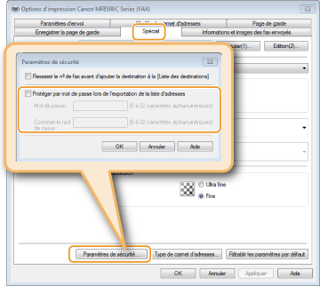 Si vous avez sélectionné [Protéger par mot de passe lors de l'exportation de la liste d'adresses] dans la boite de dialogue qui s'affiche lorsque [Paramètres de sécurité] est sélectionné dans l'onglet [Spécial], une boite de dialogue de saisie d'un mot de passe s'affiche lorsque vous cliquez sur [Exporter]. Pour plus d'informations, cliquez sur [Aide] dans l'écran du pilote de fax.