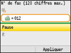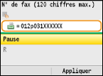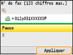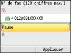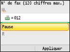 Sélectionnez <Pause> pour insérer une pause à la fin du numéro de fax, si besoin est, et appuyez sur