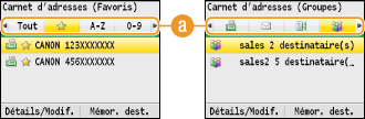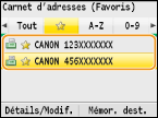 Le carnet d'adresses permet d'indiquer un destinataire en le sélectionnant dans la liste des destinataires enregistrés ou en recherchant son nom parmi les destinataires dont le nom est défini. Vous pouvez également spécifier directement un destinataire en saisissant le numéro à trois chiffres (numéro de composition codée) affecté à un destinataire.