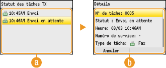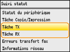 .![]() <Statut des tâches TX>/<Statut des tâches RX>Affiche la liste des documents envoyés et reçus ou en attente de traitement.