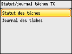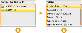.![]() <Journal des tâches TX>/<Journal des tâches RX>Affiche la liste des documents envoyés et reçus. <OK> s'affiche si un document a bien été envoyé et reçu tandis que <Erreur> s'affiche en cas d'échec de l'envoi ou de la réception d'un document, que ce soit parce que ce dernier a été annulé ou en raison d'une erreur.