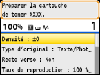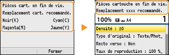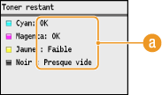 <Faible> : Le niveau du toner est bas. Assurez-vous de disposer d'une cartouche de rechange.