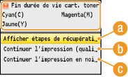 Si le message <Préparer la cartouche de toner noir.> s'affiche lorsque l'appareil reçoit un fax ou une sortie automatique de rapport est définie, les fax reçus et les rapports seront conservés dans l'appareil de sorte que leur impression ne soit pas trop pâle. Pour continuer à imprimer alors que la quantité de toner est faible, réglez <Continuer l'impression si toner faible> sur <Oui>.