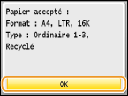 Contrôlez que le format et le type du papier mentionnés à l'écran correspondent au papier chargé dans l'appareil et appuyez sur
