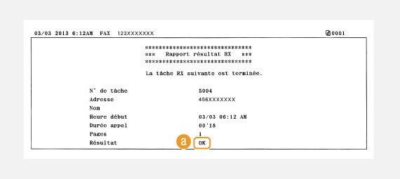Il est possible de consulter les journaux de fax reçus en imprimant un Rapport résultat RX. Il est possible d'imprimer ce rapport à l'issue de chaque transmission ou en cas d'erreur lors de la réception.