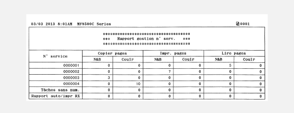 Lorsque la fonction de gestion des numéros de service est activée, vous pouvez vérifier la quantité totale d'impressions associée à chaque <Numéro de service> en imprimant un rapport de gestion des numéros de service. Déterminer le nombre total d'impressions effectuées permet de mieux gérer le papier et le toner.
