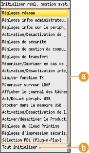 <Réglages réseau> <Initialiser Réglages réseau> <Oui> et redémarrez l'appareil. |