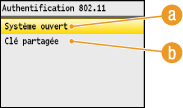 Si <Système ouvert> est sélectionné Lorsque vous connectez un réseau local sans fil, l'appareil peut être confronté à une erreur d'authentification si l'authentification de type clé partagée est définie sur le routeur sans fil. Si cela se produit, l'appareil modifie automatiquement le réglage, sélectionne <Clé partagée> et retente la connexion. |
