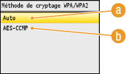 .![]() <Auto>Définit l'appareil de sorte qu'il sélectionne automatiquement AES-CCMP ou TKIP conformément au réglage du routeur sans fil.