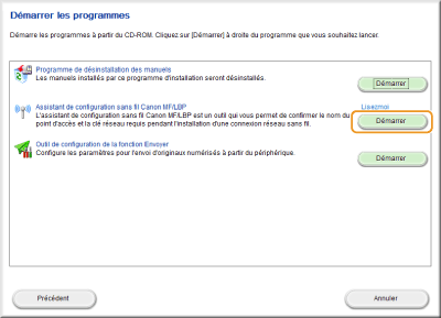 Cliquez sur [Démarrer] pour [Assistant de configuration sans fil Canon MF/LBP].