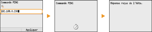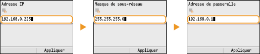 <Masque de sous-réseau> <Adresse de passerelle>.Saisissez le réglage à l'aide des touches numériques et appuyez sur <Appliquer> dans chaque écran.