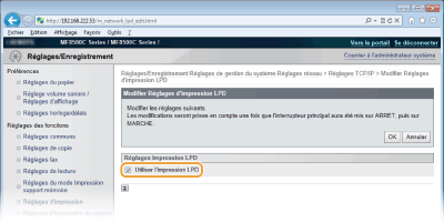 Cochez la case pour imprimer via LPD. Si tel n'est pas le cas, désactivez cette case. [Utiliser l'impression RAW]