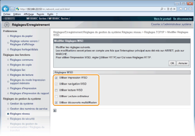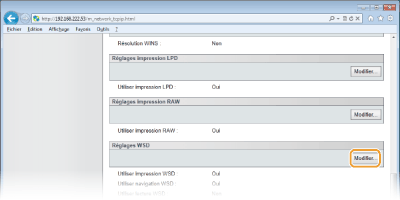 Cochez la case pour obtenir des informations sur l'appareil à partir d'un ordinateur via WSD. Cette case à cocher est automatiquement sélectionnée lorsque la case [Utiliser impression WSD] est cochée. [Utiliser lecture WSD]
