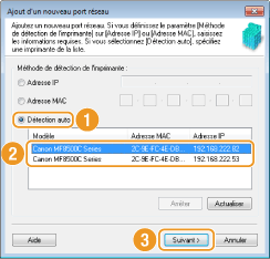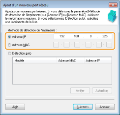 Si l'appareil n'est pas détecté Cliquez sur [Actualiser]. Si le problème persiste, cliquez sur [Adresse IP] ou [Adresse MAC], saisissez l'adresse IP ou MAC de l'appareil Affichage des réglages réseau, puis cliquez sur [Suivant].