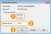 Cliquez la case d'option [LPR] ou [RAW] sous [Type de protocole], modifiez le numéro dans [Numéro de port] si nécessaire, puis cliquez sur [OK].