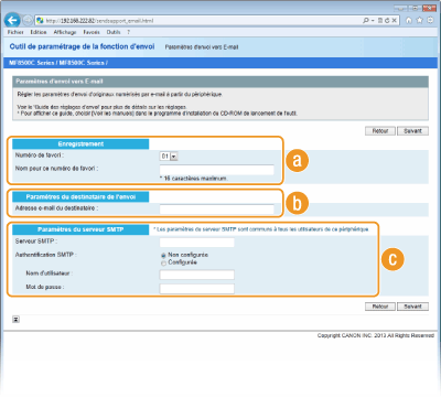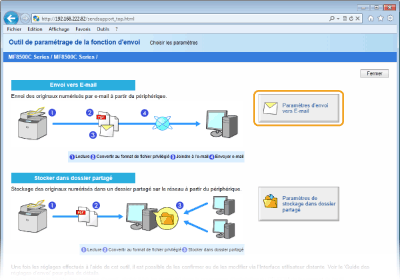 Il est possible de spécifier des réglages détaillés à l'aide de l'interface utilisateur distante au lieu de l'outil de paramétrage de la fonction d'envoi (Configuration des réglages avancés de messagerie). L'outil de paramétrage de la fonction d'envoi est conçu pour aider les utilisateurs à procéder facilement à la configuration.