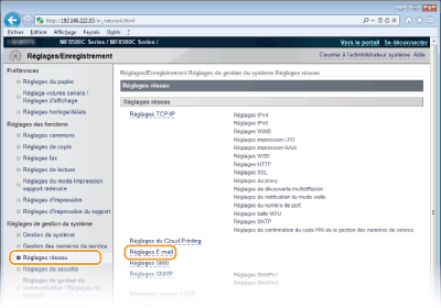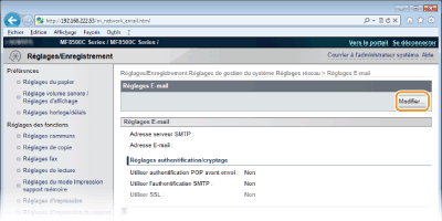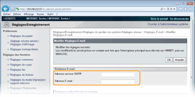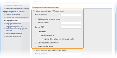 Utilisez l'interface utilisateur distante pour configurer les réglages avancés de la messagerie tels que l'authentification POP avant SMTP et le cryptage SSL. Pour plus d'informations, contactez votre fournisseur d'accès Internet ou votre administrateur réseau.