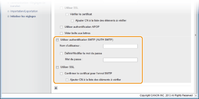 Cochez la case pour utiliser le protocole SSL afin de crypter les communications transitant par le serveur SMTP. Cochez la case pour [Confirmer le certificat pour l'envoi SMTP] ou [Ajouter CN à la liste des éléments à vérifier] en fonction de vos attentes.