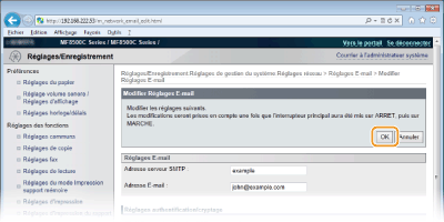 Tous les e-mails de la boîte de réception située au niveau du serveur sont supprimés dès que vous cliquez sur [OK] à l'étape 6. Si une adresse e-mail est spécifiée pour votre usage quotidien dans [Adresse E-mail ], prenez garde de ne pas supprimer des e-mails non lus. Pour minimiser ce risque, prévoyez un compte de messagerie exclusivement pour cet appareil.