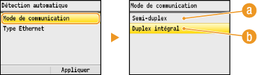 sélectionnez <Semi-duplex> ou <Duplex intégral> .![]() <Semi-duplex>Reçoit et envoie les données de communication en alternance. Sélectionnez cette option si l'appareil est relié à un périphérique de réseau en semi-duplex.