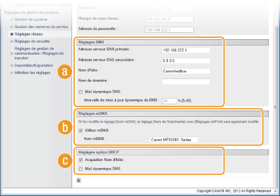 Adopté par Bonjour, le protocole mDNS (multicast DNS) est un protocole associant le nom d'hôte à une adresse IP sans faire intervenir le DNS. Cochez la case pour activer mDNS et saisissez le nom mDNS dans la zone de texte [Nom mDNS ]. [Réglages option DHCP][Acquisition Nom d'hôte ]