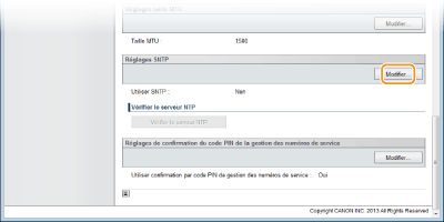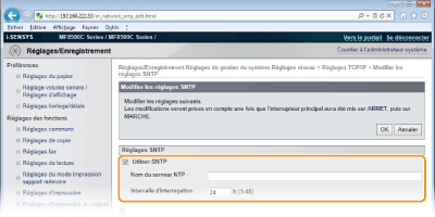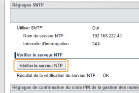 Test des communications avec le serveur NTP/SNTPVous pouvez tester les communications entre l'appareil et le serveur de temps enregistré via SNTP. Accédez à [Réglages/Enregistrement]