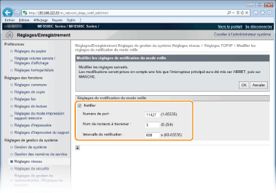 Indiquez le nombre de routeurs que les paquets de notification peuvent traverser. Saisissez un nombre compris entre 0 et 254. [Intervalle de notification ]