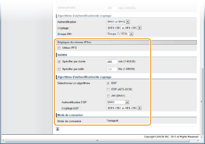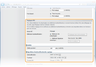 Spécifiez les réglages [Valide pendant ] et [Authentification ]/[Cryptage ]/[Groupe DH ]