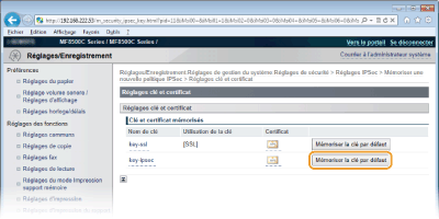 Cliquez sur [Mémoriser la clé par défaut] à droite de la paire de clés à utiliser.