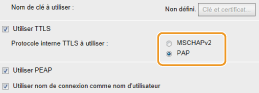 REMARQUE : Protocole interne pour TTLS Vous pouvez sélectionner MSCHAPv2 ou PAP. Si vous comptez utiliser PAP, cliquez sur la case d'option [PAP].