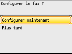 Si vous avez sélectionné <Plus tard>, le mode de réception est défini sur <Auto>. Par la suite, quand vous êtes prêt à configurer les réglages du fax, affichez l'écran de configuration en appuyant sur