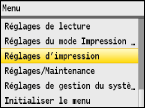 Disponibilité des réglagesTous les réglages de l'imprimante décrits dans cette section, hormis <Ignorer format papier> (Ignorer format papier), ne sont disponibles que pour l'impression PCL. Définir ces réglages ne présente pas d'intérêt, par exemple, si vous imprimez à l'aide d'un pilote d'imprimante UFRII LT.