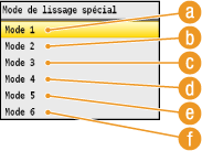 Si <Diffusion d'erreur> est activé pour <Demi-teintes> (Demi-teintes), <Mode 1>, <Mode 2>, <Mode 3> et <Mode 4> ont les mêmes effets sur les impressions que le réglage <Mode 6>.
