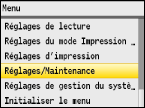 Tous les réglages relatifs à la configuration et à l'entretien répertoriés s'accompagnent d'une brève description. Les réglages par défaut sont signalés par une croix (