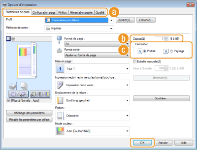 Spécifiez les réglages d'impression tels que le nombre de copies et l'orientation et cliquez sur [OK].
