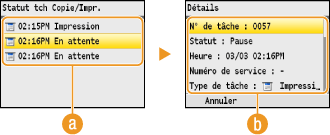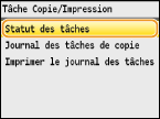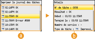 .![]() <Imprimer le journal des tâches>Affiche la liste des documents imprimés. <OK> s'affiche si un document a bien été imprimé tandis que <Erreur> s'affiche en cas d'échec de l'impression, que ce soit en raison d'une annulation de l'opération ou d'une erreur.