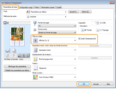 Vous pouvez imprimer un document d'une page sur plusieurs pages. Si, par exemple, vous voulez produire un document au format A4 neuf fois plus grand, vous obtiendrez une affiche de 3 feuilles sur 3 au format A4 après avoir imprimé le document et collez les feuilles ensemble.