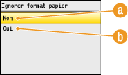 Lorsque vous envoyez un document à l'impression à partir d'un ordinateur, il est possible de définir de nombreux paramètres d'impression (le nombre de copies ou le mode couleur, par exemple) au niveau de l'application dont vous vous servez pour réaliser le document ou encore au niveau du pilote d'imprimante. Néanmoins, le réglage <Ignorer format papier> décrit ci-dessous ne peut être défini que sur l'appareil.