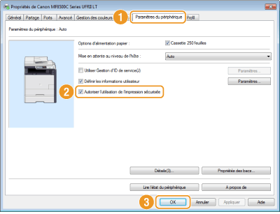 Cliquez sur l'onglet [Paramètres du périphérique] et contrôlez que la case [Autoriser l'utilisation de l'impression sécurisée] est cochée.