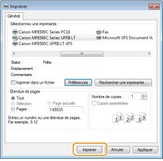 Sélectionnez le pilote d'imprimante de l'appareil et cliquez sur [Préférences] (ou [Propriétés]).