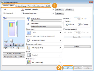 Cliquez sur les onglets [Paramètres de base], [Configuration page], [Finition], [Alimentation papier] ou [Qualité] pour choisir les réglages d'impression figurant sur chaque écran.