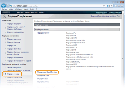 Vous devez activer Google Cloud Print. Cliquez sur [Modifier...], cochez la case [Utiliser le Cloud Printing], cliquez sur [OK] et redémarrez l'appareil.