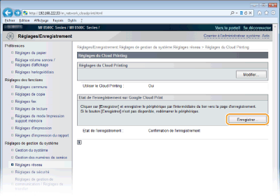 Cliquez sur [Enregistrer...] dans [Etat de l'enregistrement sur Google Cloud Print].