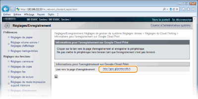Pour imprimer avec Google Cloud Print, enregistrez l'appareil auprès du service Google Cloud Print.