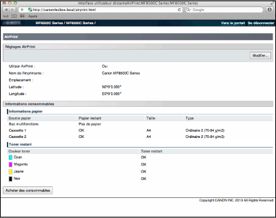 Vous pouvez afficher l'écran pour AirPrint dans lequel vous avez accès non seulement aux réglages AirPrint, mais aussi aux informations sur les consommables tels que le papier et le toner.