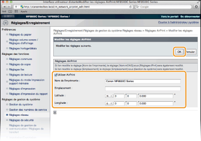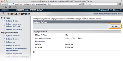Vous pouvez enregistrer des informations, notamment le nom de l'appareil et le lieu de l'installation, destinées à identifier l'appareil. Il est également possible de désactiver la fonction AirPrint de l'appareil. Servez-vous de l'interface utilisateur distante pour les modifier.