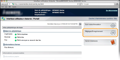Pour vérifier l'état de l'appareil ou le niveau des fournitures, connectez-vous également en mode Utilisateur final.
