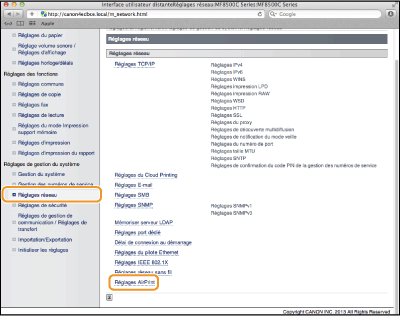 Activer AirPrint en cochant la case [Utiliser AirPrint] active également les réglages <Utiliser HTTP> et <Réglages mDNS> (IPv4).